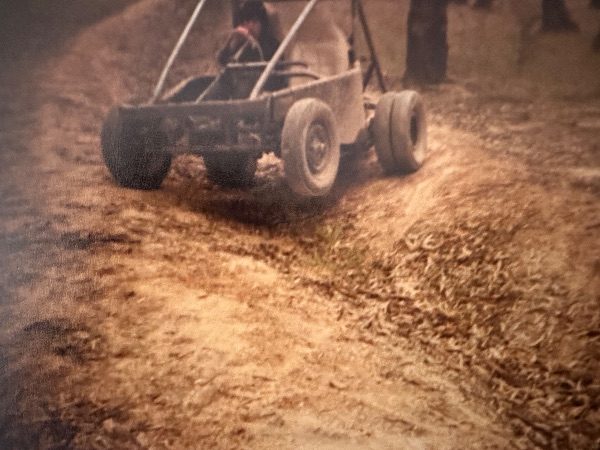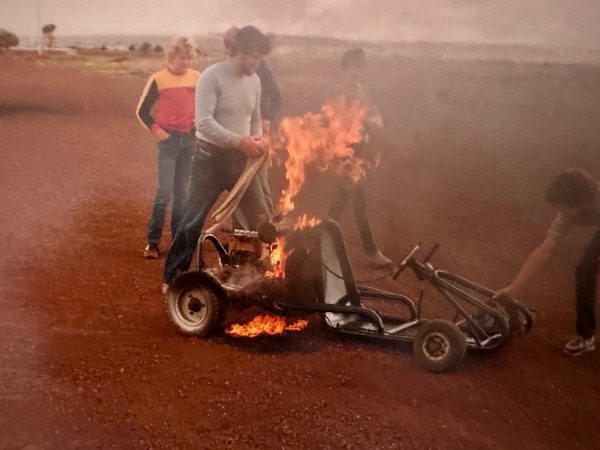 Me as I am always looking for more machinery to buy. I was looking over the fence of the neighbours house to find this dirt go kart in the long grass. I brought it and realised it had a 650cc 2 cylinder motorbike motor and 5 speed gearbox ( Very Fast ). We got it running and the first day out it caught fire whilst Dad was driving. He was going at speed so he didn’t realise till the engine stopped. The fuel tank was on top and we had nothing to put flames out so it never ran again.